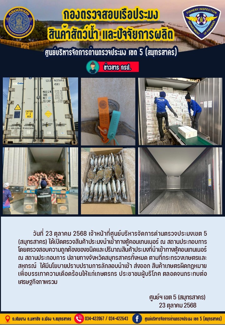 วันที่ 23 ตุลาคม 2568 เจ้าหน้าที่ศูนย์บริหารจัดการด่านตรวจประมงเขต5 (สมุทรสาคร) ได้เปิดตรวจสินค้าประมงนำเข้าทางตู้คอนเทนเนอร์ ณ สถานประกอบการ