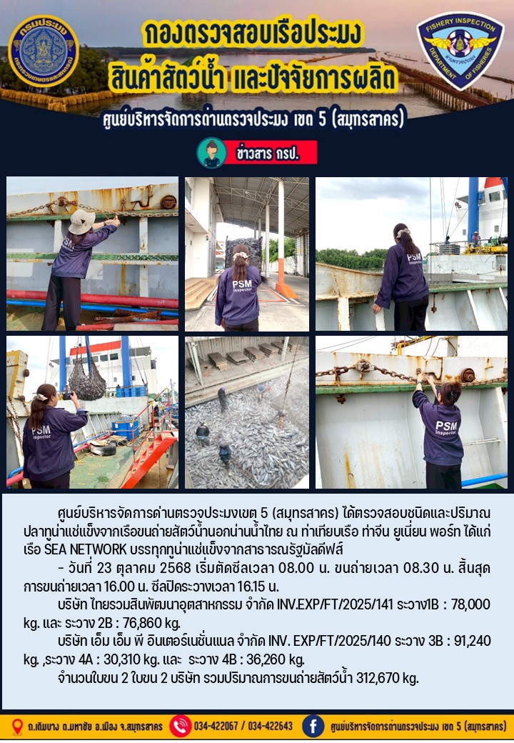 [2025-10-29] รายงานการตรวจเรือประมงที่แจ้งเข้าออกประจำวันที่ 27 ตุลาคม 2568.. [2025-10-29] รายงานการตรวจเรือประมงที่แจ้งเข้าออกประจำวันที่ 26 ตุลาคม 2568.. [2025-10-29] รายงานการตรวจเรือประมงที่แจ้งเข้าออกประจำวันที่ 25 ตุลาคม 2568.. [2025-10-29] วันที่ 25 ตุลาคม 2568 เจ้าหน้าที่ศูนย์บริหารจัดการด่านตรวจประมงเขต5 (ส.. [2025-10-29] รายงานการตรวจเรือประมงที่แจ้งเข้าออกประจำวันที่ 24 ตุลาคม 2568.. [2025-10-29] วันที่ 24 ตุลาคม 2568 เจ้าหน้าที่ศูนย์บริหารจัดการด่านตรวจประมงเขต5 (ส.. [2025-10-29] การขนถ่ายทูน่าแช่แข็งจากเรือขนถ่ายสัตว์น้ำสัญชาติไทย เรือ SEA NETWORK.. [2025-10-29] รายงานการตรวจเรือประมงที่แจ้งเข้าออกประจำวันที่ 23 ตุลาคม 2568.. [2025-10-29] การขนถ่ายทูน่าแช่แข็งจากเรือขนถ่ายสัตว์น้ำสัญชาติไทย เรือ SEA NETWORK.. [2025-10-29] วันที่ 23 ตุลาคม 2568 เจ้าหน้าที่ศูนย์บริหารจัดการด่านตรวจประมงเขต5 (ส.. อ่านทั้งหมด
