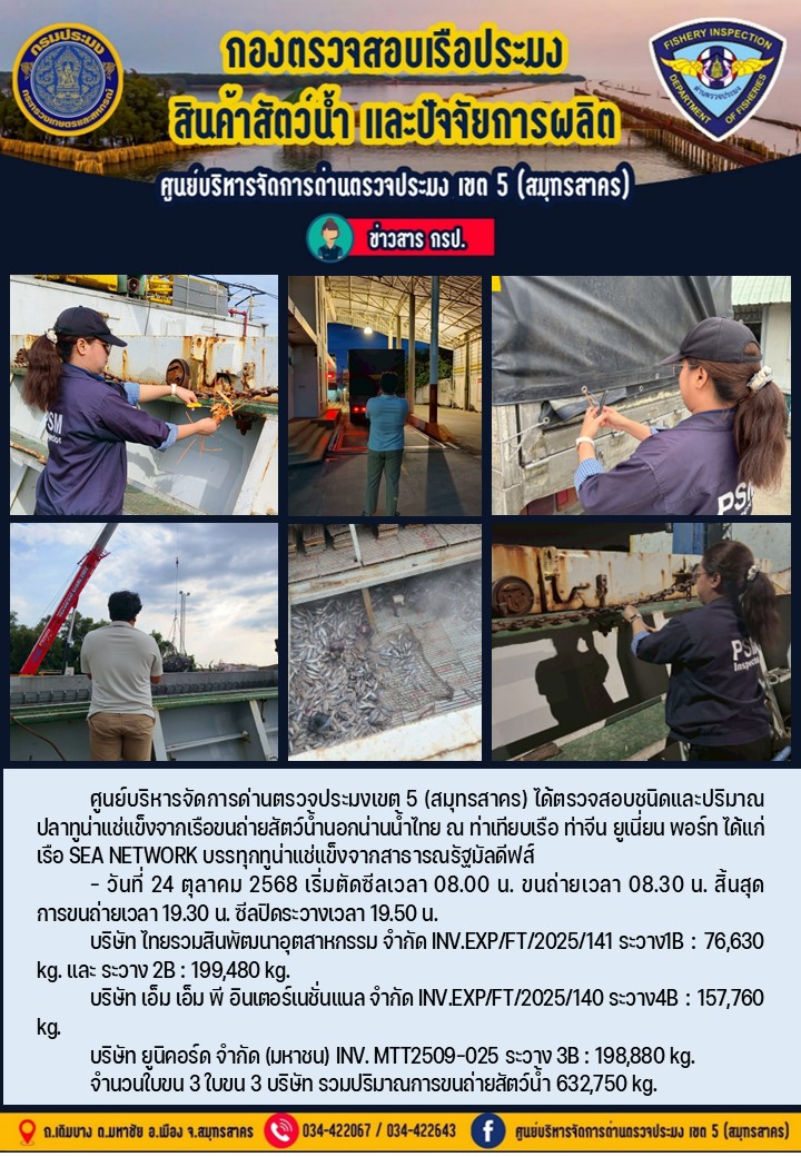 [2025-10-29] รายงานการตรวจเรือประมงที่แจ้งเข้าออกประจำวันที่ 27 ตุลาคม 2568.. [2025-10-29] รายงานการตรวจเรือประมงที่แจ้งเข้าออกประจำวันที่ 26 ตุลาคม 2568.. [2025-10-29] รายงานการตรวจเรือประมงที่แจ้งเข้าออกประจำวันที่ 25 ตุลาคม 2568.. [2025-10-29] วันที่ 25 ตุลาคม 2568 เจ้าหน้าที่ศูนย์บริหารจัดการด่านตรวจประมงเขต5 (ส.. [2025-10-29] รายงานการตรวจเรือประมงที่แจ้งเข้าออกประจำวันที่ 24 ตุลาคม 2568.. [2025-10-29] วันที่ 24 ตุลาคม 2568 เจ้าหน้าที่ศูนย์บริหารจัดการด่านตรวจประมงเขต5 (ส.. [2025-10-29] การขนถ่ายทูน่าแช่แข็งจากเรือขนถ่ายสัตว์น้ำสัญชาติไทย เรือ SEA NETWORK.. [2025-10-29] รายงานการตรวจเรือประมงที่แจ้งเข้าออกประจำวันที่ 23 ตุลาคม 2568.. [2025-10-29] การขนถ่ายทูน่าแช่แข็งจากเรือขนถ่ายสัตว์น้ำสัญชาติไทย เรือ SEA NETWORK.. [2025-10-29] วันที่ 23 ตุลาคม 2568 เจ้าหน้าที่ศูนย์บริหารจัดการด่านตรวจประมงเขต5 (ส.. อ่านทั้งหมด