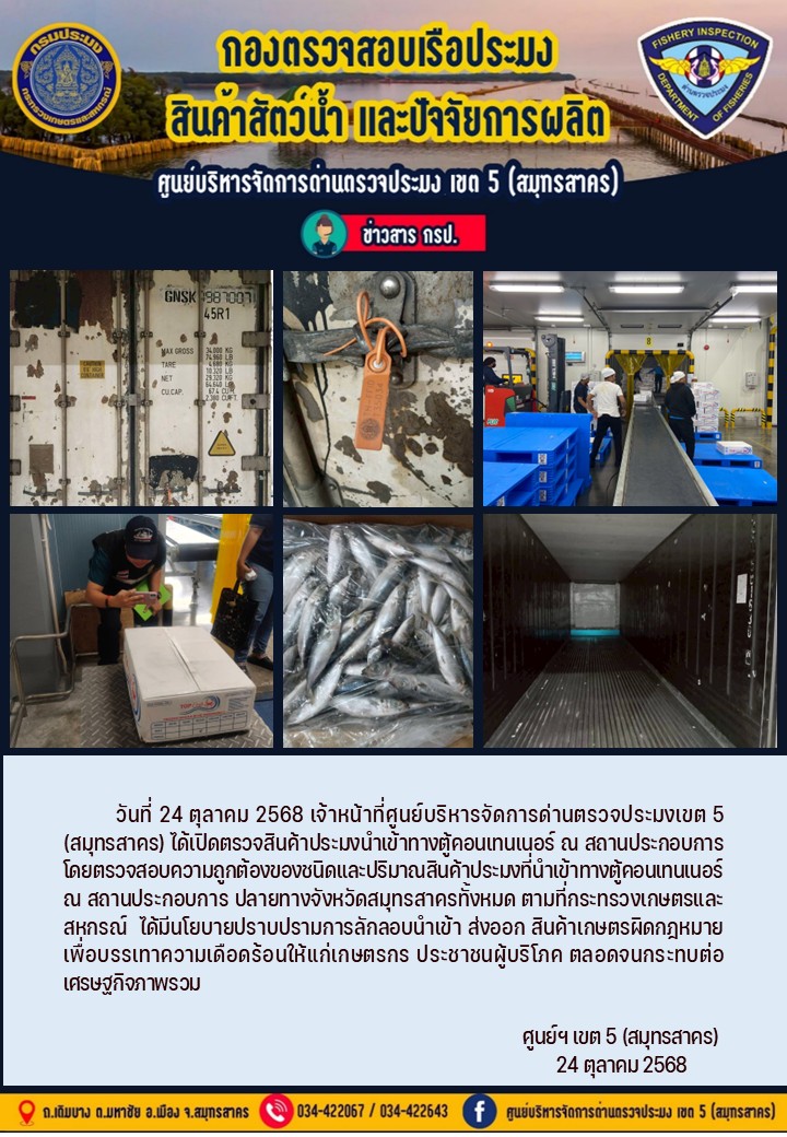 วันที่ 24 ตุลาคม 2568 เจ้าหน้าที่ศูนย์บริหารจัดการด่านตรวจประมงเขต5 (สมุทรสาคร) ได้เปิดตรวจสินค้าประมงนำเข้าทางตู้คอนเทนเนอร์ ณ สถานประกอบการ