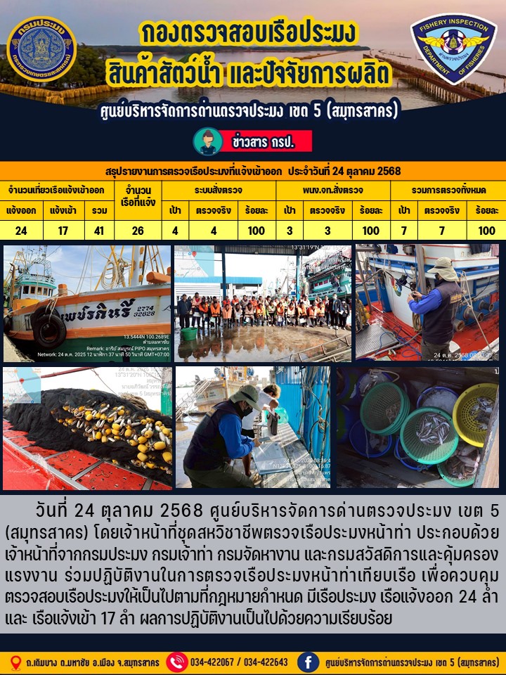 รายงานการตรวจเรือประมงที่แจ้งเข้าออกประจำวันที่ 24 ตุลาคม 2568