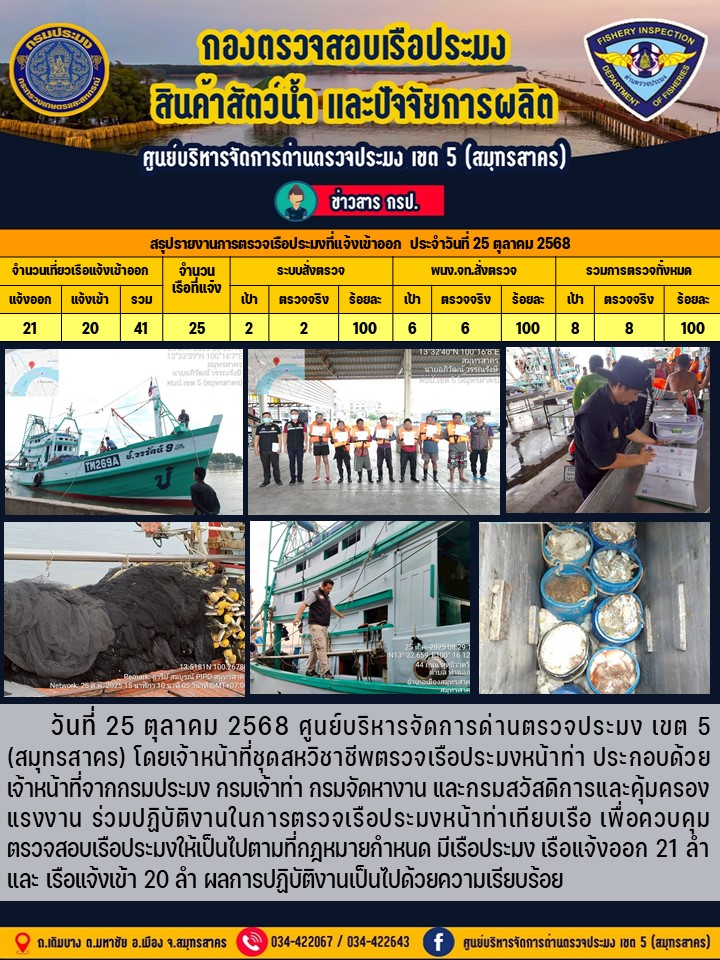 รายงานการตรวจเรือประมงที่แจ้งเข้าออกประจำวันที่ 25 ตุลาคม 2568