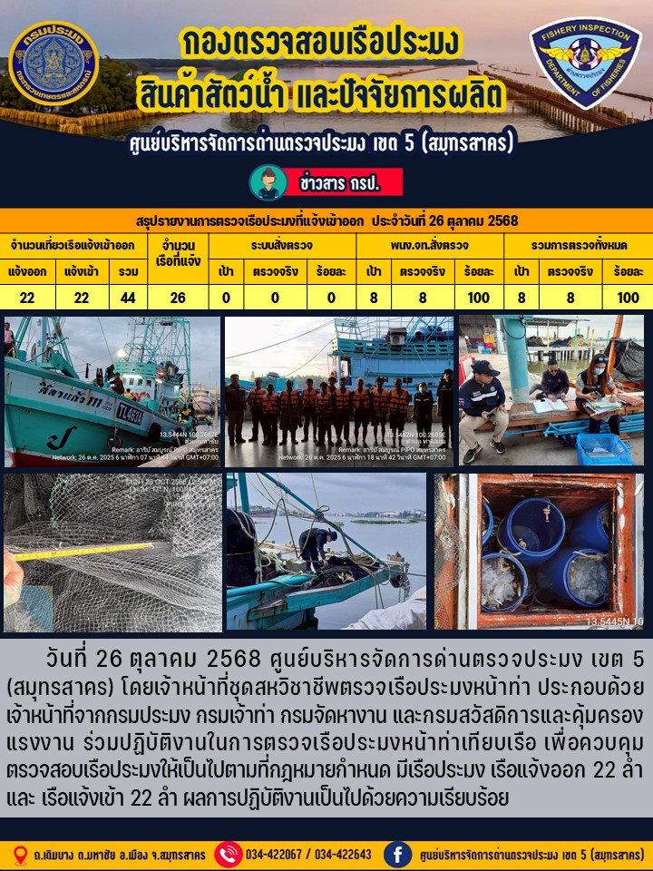 รายงานการตรวจเรือประมงที่แจ้งเข้าออกประจำวันที่ 26 ตุลาคม 2568