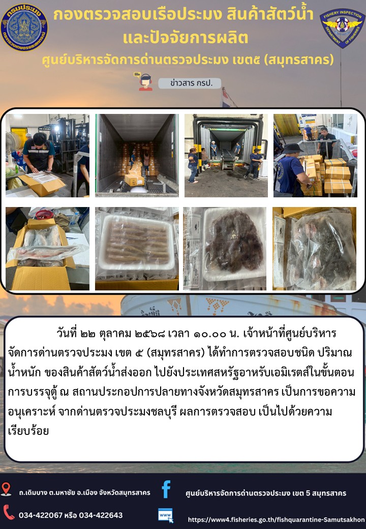 วันที่ 22 ตุลาคม 2568 เจ้าหน้าที่ศูนย์บริหารจัดการด่านตรวจประมงเขต5 (สมุทรสาคร) ได้เปิดตรวจสินค้าประมงส่งออกทางตู้คอนเทนเนอร์ ณ สถานประกอบการ