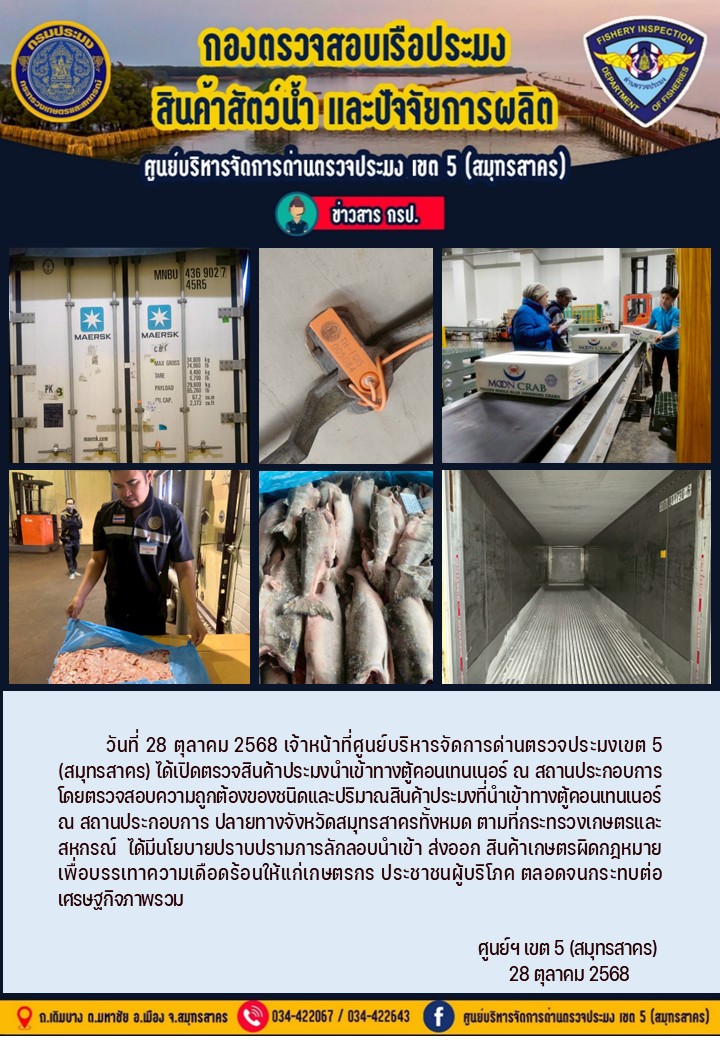 วันที่ 28 ตุลาคม 2568 เจ้าหน้าที่ศูนย์บริหารจัดการด่านตรวจประมงเขต5 (สมุทรสาคร) ได้เปิดตรวจสินค้าประมงนำเข้าทางตู้คอนเทนเนอร์ ณ สถานประกอบการ