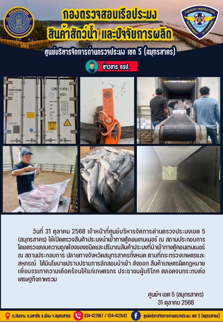 วันที่ 31 ตุลาคม 2568 เจ้าหน้าที่ศูนย์บริหารจัดการด่านตรวจประมงเขต5 (สมุทรสาคร) ได้เปิดตรวจสินค้าประมงนำเข้าทางตู้คอนเทนเนอร์ ณ สถานประกอบการ