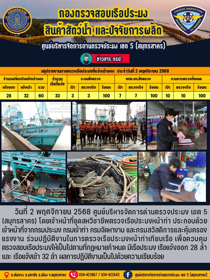 รายงานการตรวจเรือประมงที่แจ้งเข้าออกประจำวันที่ 2 พฤศจิกายน 2568