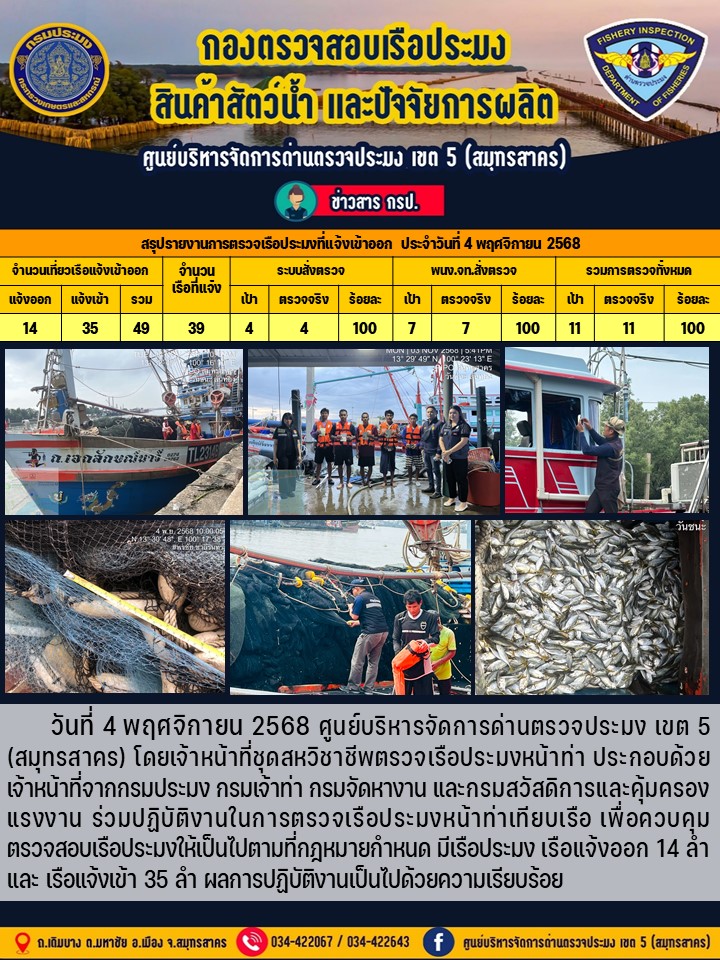 รายงานการตรวจเรือประมงที่แจ้งเข้าออกประจำวันที่ 4 พฤศจิกายน 2568