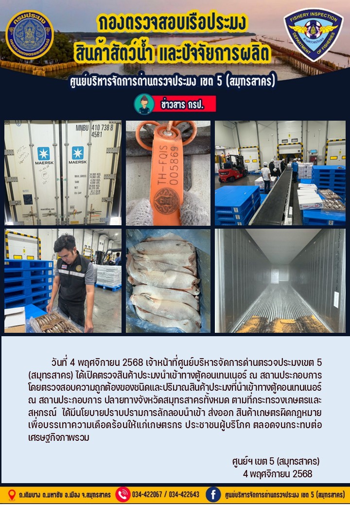 วันที่ 4 พฤศจิกายน 2568 เจ้าหน้าที่ศูนย์บริหารจัดการด่านตรวจประมงเขต5 (สมุทรสาคร) ได้เปิดตรวจสินค้าประมงนำเข้าทางตู้คอนเทนเนอร์ ณ สถานประกอบการ