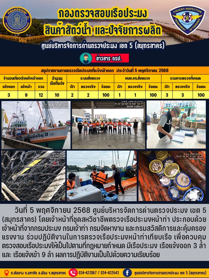รายงานการตรวจเรือประมงที่แจ้งเข้าออกประจำวันที่ 5 พฤศจิกายน 2568