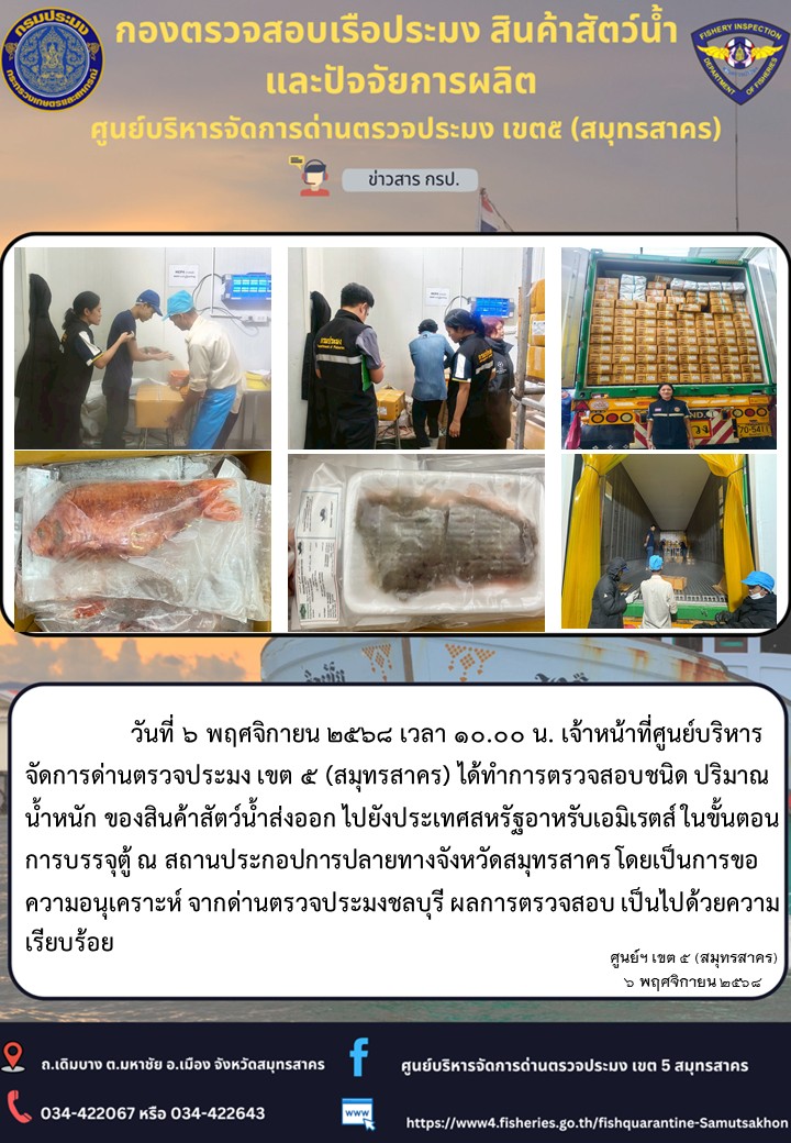 วันที่ 6 พฤศจิกายน 2568 เจ้าหน้าที่ศูนย์บริหารจัดการด่านตรวจประมงเขต5 (สมุทรสาคร) ได้เปิดตรวจสินค้าประมงส่งออกทางตู้คอนเทนเนอร์ ณ สถานประกอบการ