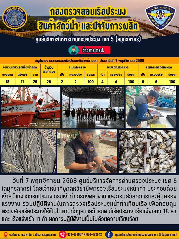 รายงานการตรวจเรือประมงที่แจ้งเข้าออกประจำวันที่ 7 พฤศจิกายน 2568