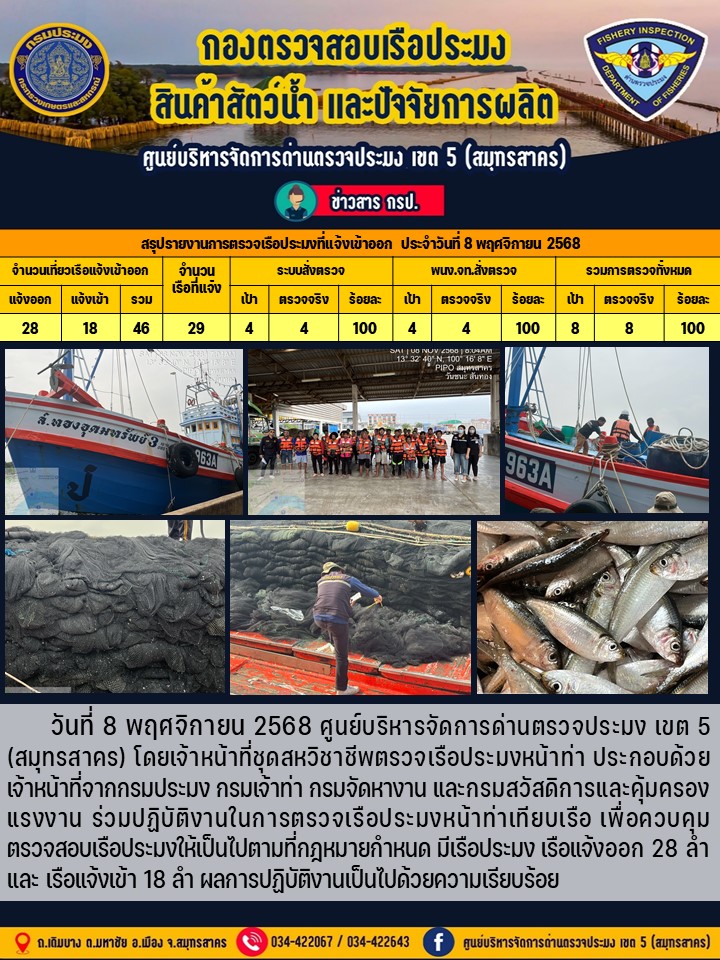 รายงานการตรวจเรือประมงที่แจ้งเข้าออกประจำวันที่ 8 พฤศจิกายน 2568
