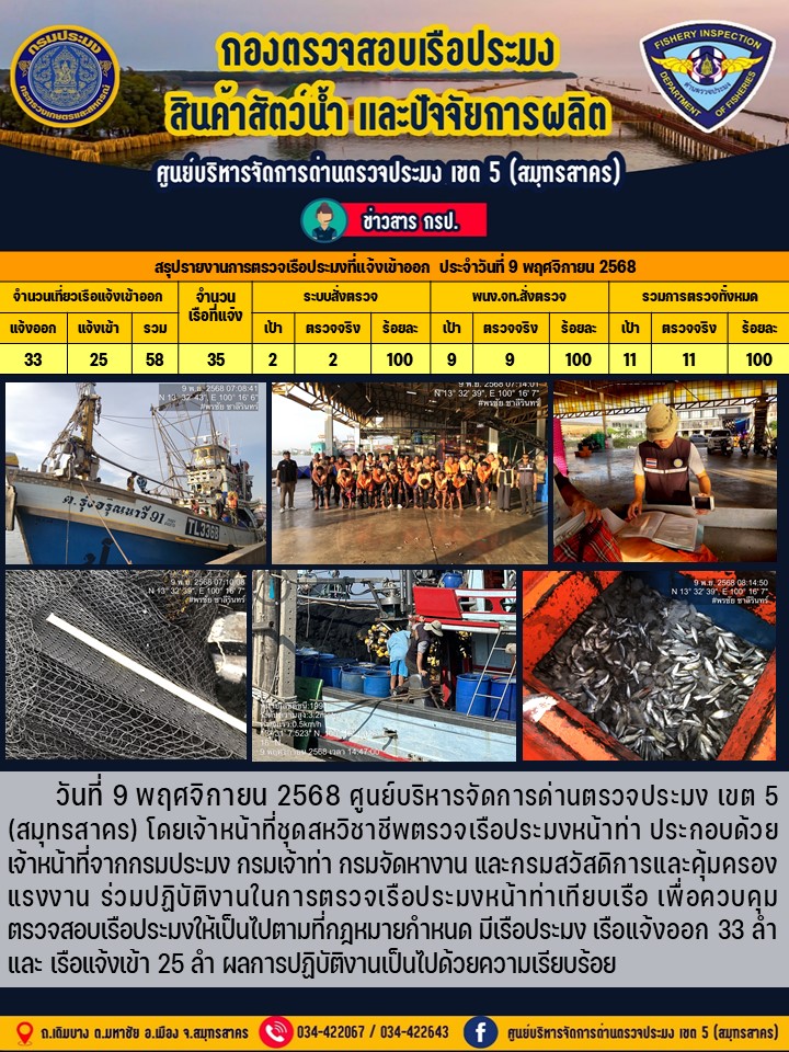 รายงานการตรวจเรือประมงที่แจ้งเข้าออกประจำวันที่ 9 พฤศจิกายน 2568