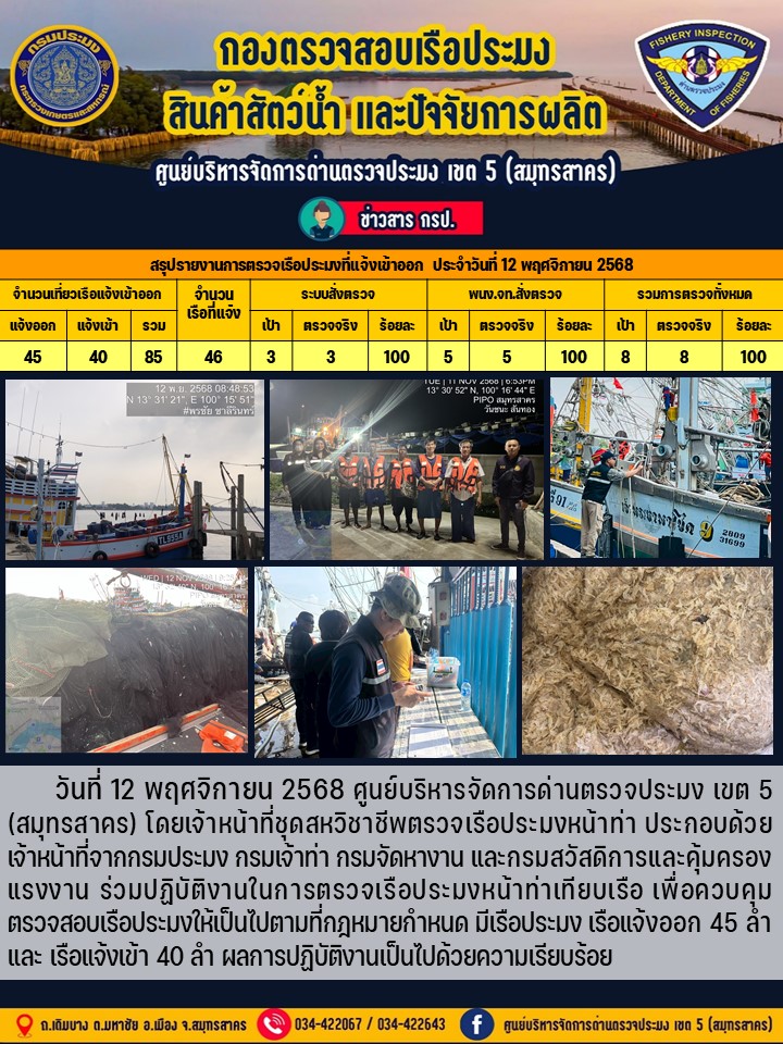 รายงานการตรวจเรือประมงที่แจ้งเข้าออกประจำวันที่ 12 พฤศจิกายน 2568