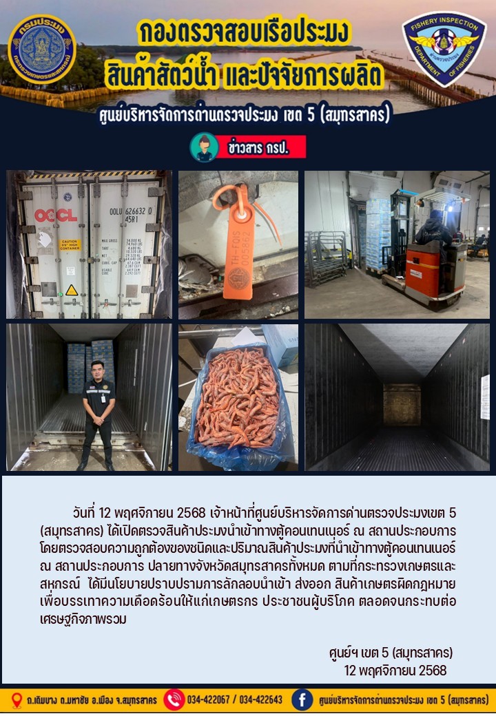 วันที่ 12 พฤศจิกายน 2568 เจ้าหน้าที่ศูนย์บริหารจัดการด่านตรวจประมงเขต5 (สมุทรสาคร) ได้เปิดตรวจสินค้าประมงนำเข้าทางตู้คอนเทนเนอร์ ณ สถานประกอบการ