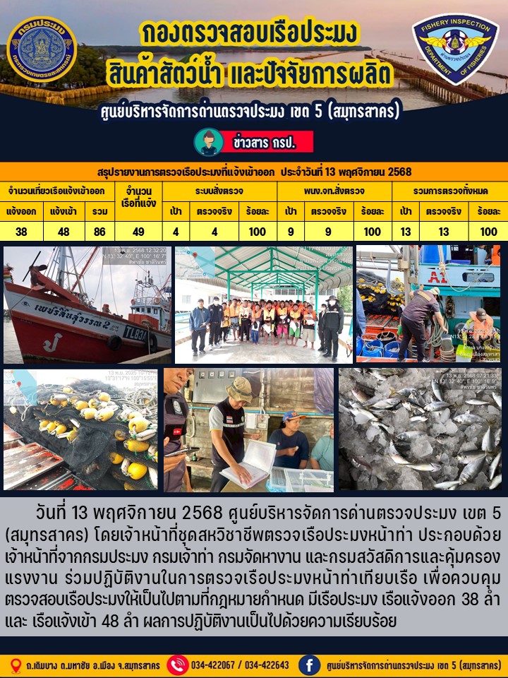 รายงานการตรวจเรือประมงที่แจ้งเข้าออกประจำวันที่ 13 พฤศจิกายน 2568