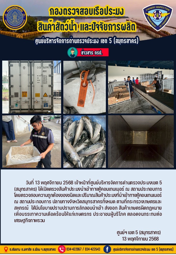 วันที่ 13 พฤศจิกายน 2568 เจ้าหน้าที่ศูนย์บริหารจัดการด่านตรวจประมงเขต5 (สมุทรสาคร) ได้เปิดตรวจสินค้าประมงนำเข้าทางตู้คอนเทนเนอร์ ณ สถานประกอบการ