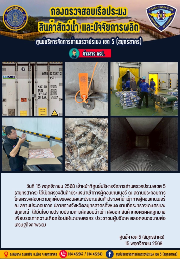 วันที่ 15 พฤศจิกายน 2568 เจ้าหน้าที่ศูนย์บริหารจัดการด่านตรวจประมงเขต5 (สมุทรสาคร) ได้เปิดตรวจสินค้าประมงนำเข้าทางตู้คอนเทนเนอร์ ณ สถานประกอบการ