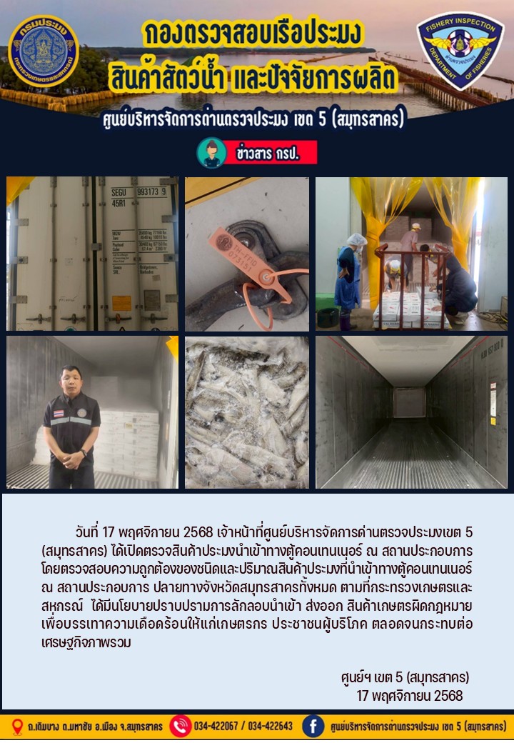 วันที่ 17 พฤศจิกายน 2568 เจ้าหน้าที่ศูนย์บริหารจัดการด่านตรวจประมงเขต5 (สมุทรสาคร) ได้เปิดตรวจสินค้าประมงนำเข้าทางตู้คอนเทนเนอร์ ณ สถานประกอบการ