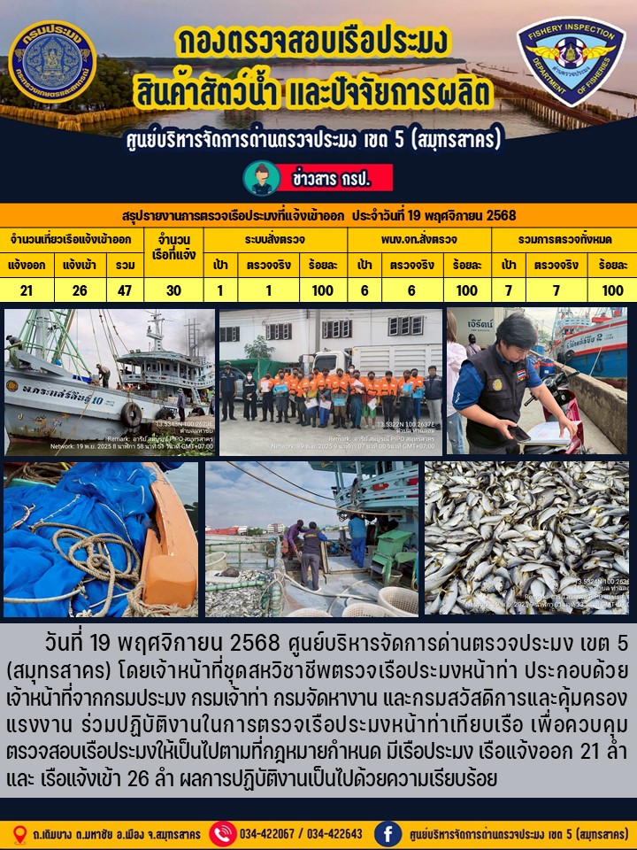 รายงานการตรวจเรือประมงที่แจ้งเข้าออกประจำวันที่ 19 พฤศจิกายน 2568