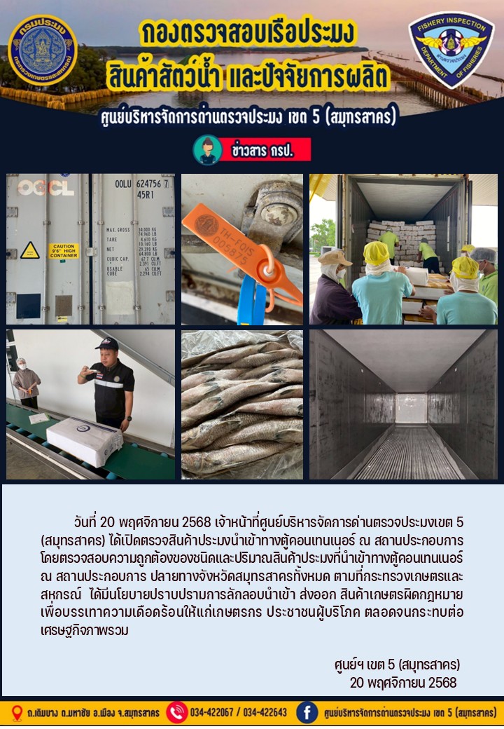 วันที่ 20 พฤศจิกายน 2568 เจ้าหน้าที่ศูนย์บริหารจัดการด่านตรวจประมงเขต5 (สมุทรสาคร) ได้เปิดตรวจสินค้าประมงนำเข้าทางตู้คอนเทนเนอร์ ณ สถานประกอบการ
