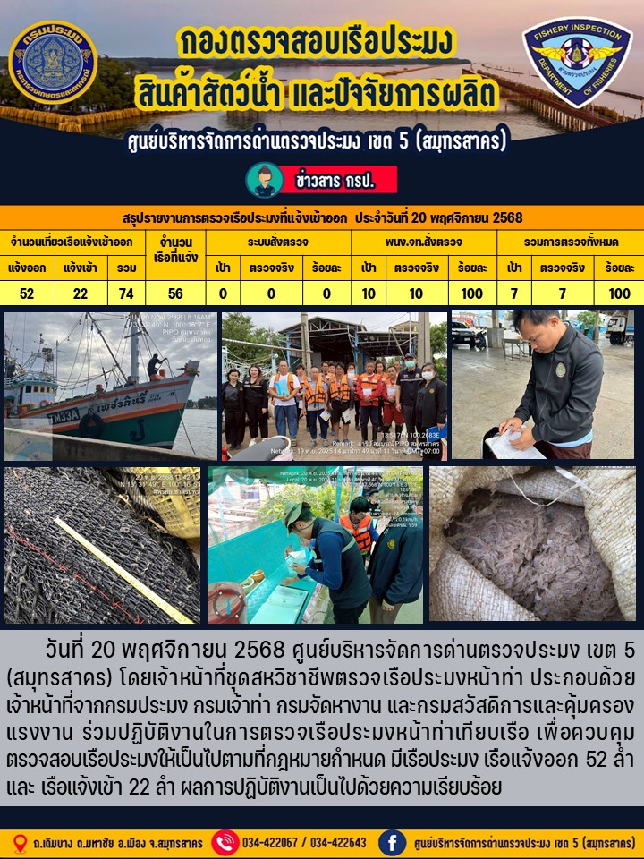 รายงานการตรวจเรือประมงที่แจ้งเข้าออกประจำวันที่ 20 พฤศจิกายน 2568