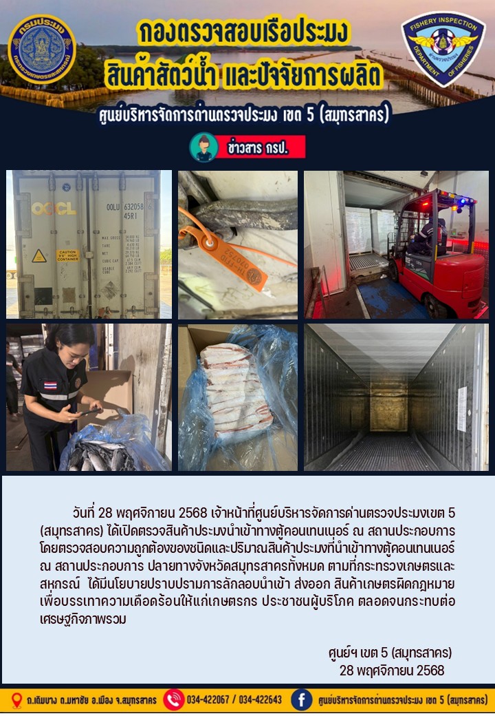 วันที่ 28 พฤศจิกายน 2568 เจ้าหน้าที่ศูนย์บริหารจัดการด่านตรวจประมงเขต5 (สมุทรสาคร) ได้เปิดตรวจสินค้าประมงส่งออกทางตู้คอนเทนเนอร์ ณ สถานประกอบการ