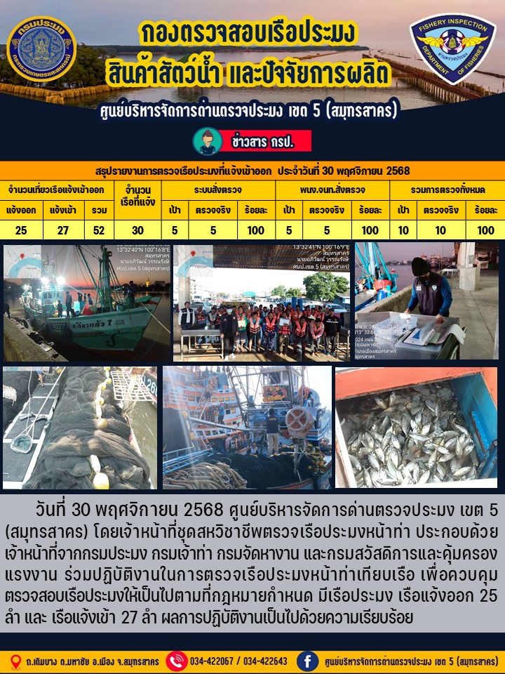 รายงานการตรวจเรือประมงที่แจ้งเข้าออกประจำวันที่ 30 พฤศจิกายน 2568