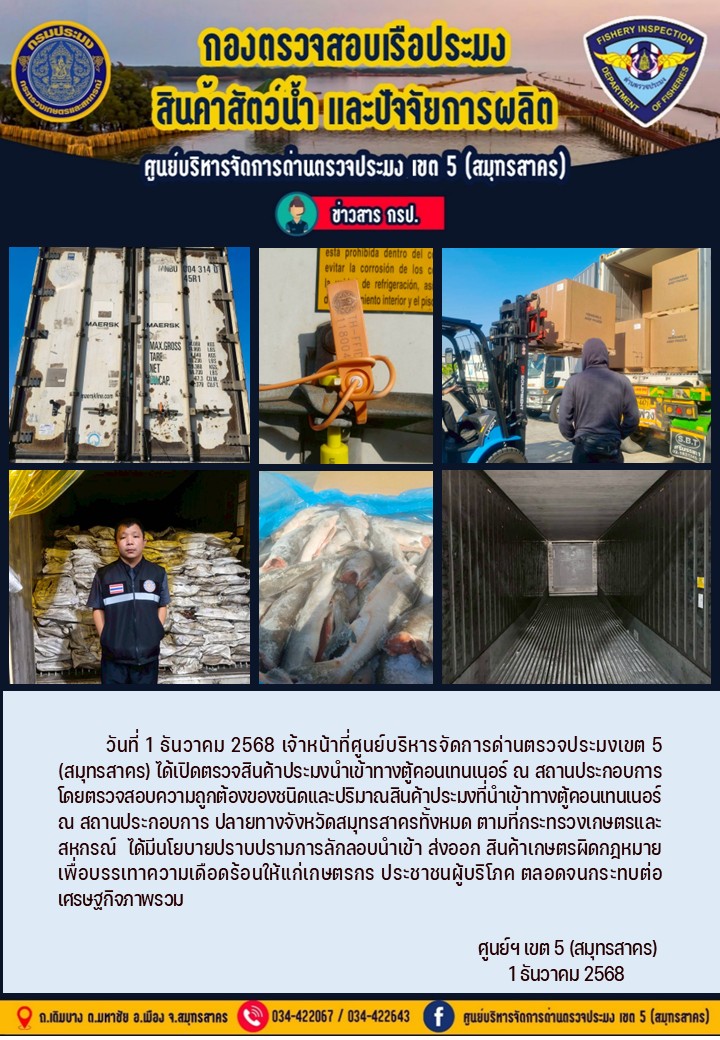 วันที่ 1 ธันวาคม 2568 เจ้าหน้าที่ศูนย์บริหารจัดการด่านตรวจประมงเขต5 (สมุทรสาคร) ได้เปิดตรวจสินค้าประมงส่งออกทางตู้คอนเทนเนอร์ ณ สถานประกอบการ