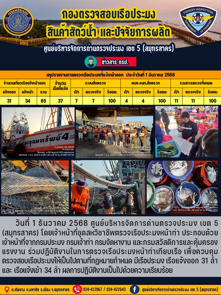 รายงานการตรวจเรือประมงที่แจ้งเข้าออกประจำวันที่ 1 ธันวาคม 2568