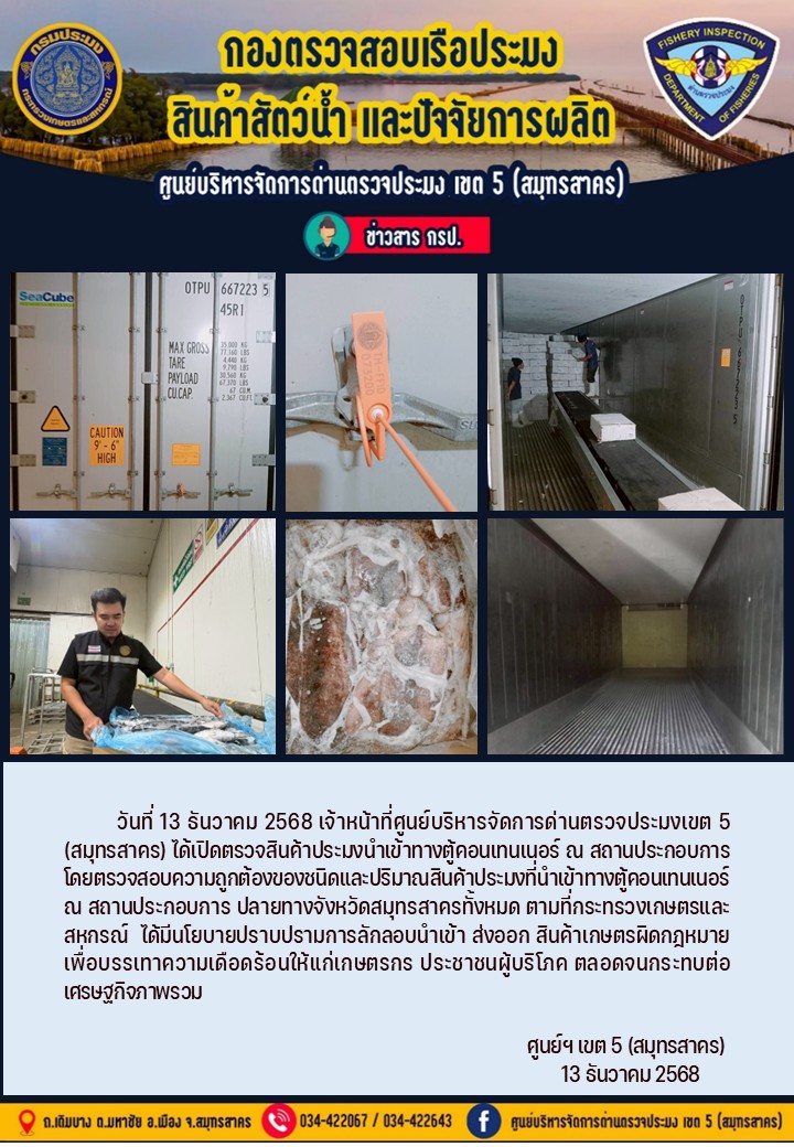 วันที่ 13 ธันวาคม 2568 เจ้าหน้าที่ศูนย์บริหารจัดการด่านตรวจประมงเขต5 (สมุทรสาคร) ได้เปิดตรวจสินค้าประมงนำเข้าทางตู้คอนเทนเนอร์ ณ สถานประกอบการ