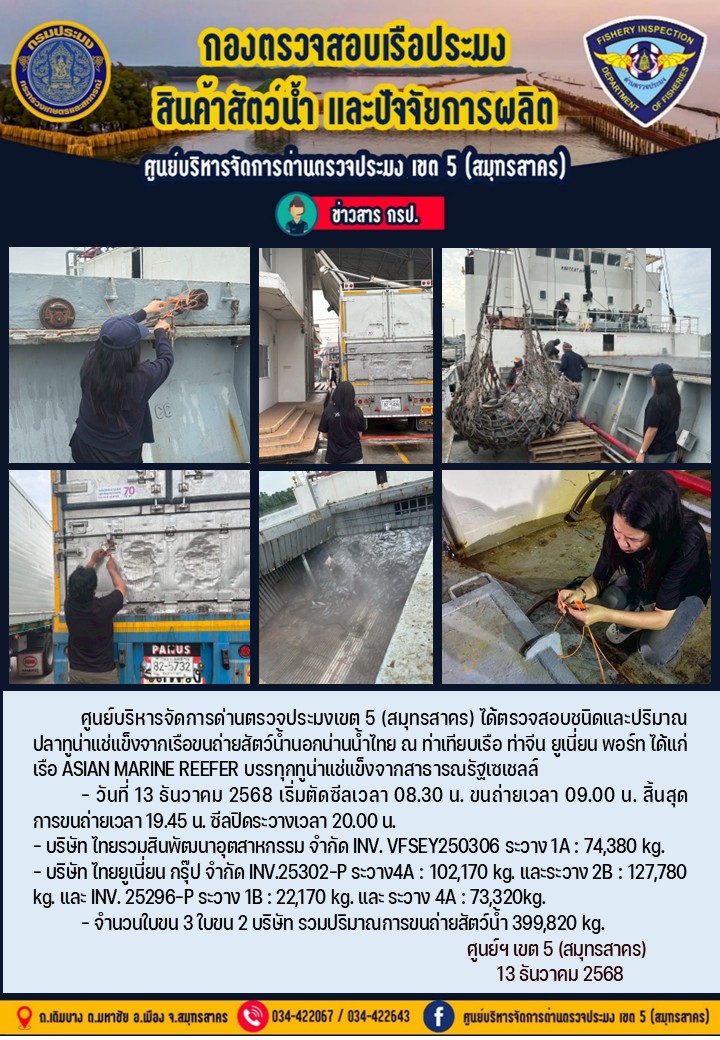 การขนถ่ายทูน่าแช่แข็งจากเรือขนถ่ายสัตว์น้ำสัญชาติไทย เรือ ASIAN MARINE REEFER บรรทุกทูน่าแช่แข็งจากประเทศมัลดีฟส์ วันที่ 13 ธันวาคม 2568