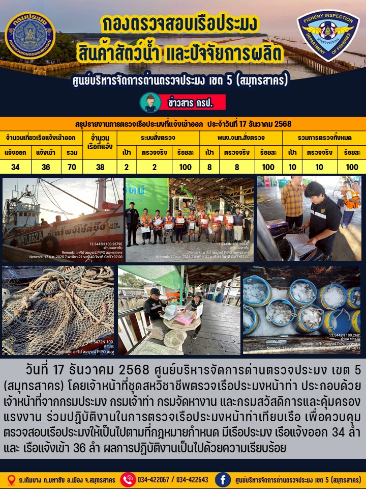 รายงานการตรวจเรือประมงที่แจ้งเข้าออกประจำวันที่ 17 ธันวาคม 2568