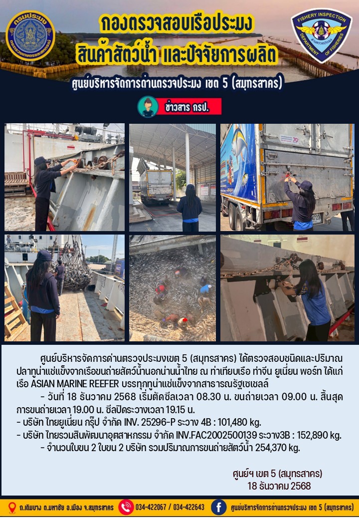 [2025-12-24] รายงานการตรวจเรือประมงที่แจ้งเข้าออกประจำวันที่ 21 ธันวาคม 2568.. [2025-12-24] รายงานการตรวจเรือประมงที่แจ้งเข้าออกประจำวันที่ 20 ธันวาคม 2568.. [2025-12-24] รายงานการตรวจเรือประมงที่แจ้งเข้าออกประจำวันที่ 19 ธันวาคม 2568.. [2025-12-24] รายงานการตรวจเรือประมงที่แจ้งเข้าออกประจำวันที่ 18 ธันวาคม 2568.. [2025-12-24] วันที่ 18 ธันวาคม 2568 เจ้าหน้าที่ศูนย์บริหารจัดการด่านตรวจประมงเขต5 (.. [2025-12-24] การขนถ่ายทูน่าแช่แข็งจากเรือขนถ่ายสัตว์น้ำสัญชาติไทย เรือ ASIAN MARINE.. [2025-12-24] รายงานการตรวจเรือประมงที่แจ้งเข้าออกประจำวันที่ 17 ธันวาคม 2568.. [2025-12-24] วันที่ 17 ธันวาคม 2568 เจ้าหน้าที่ศูนย์บริหารจัดการด่านตรวจประมงเขต5 (.. [2025-12-18] การขนถ่ายทูน่าแช่แข็งจากเรือขนถ่ายสัตว์น้ำสัญชาติไทย เรือ ASIAN MARINE.. [2025-12-18] วันที่ 16 ธันวาคม 2568 เจ้าหน้าที่ศูนย์บริหารจัดการด่านตรวจประมงเขต5 (.. อ่านทั้งหมด