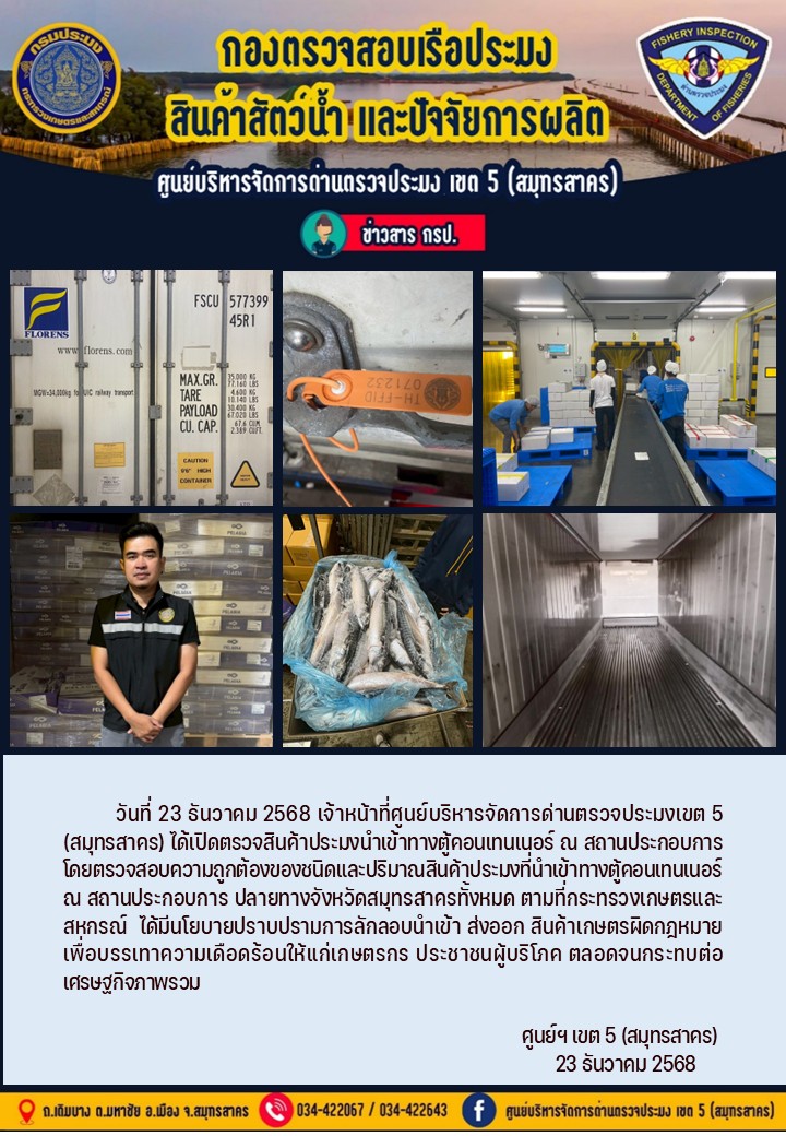 วันที่ 23 ธันวาคม 2568 เจ้าหน้าที่ศูนย์บริหารจัดการด่านตรวจประมงเขต5 (สมุทรสาคร) ได้เปิดตรวจสินค้าประมงนำเข้าทางตู้คอนเทนเนอร์ ณ สถานประกอบการ