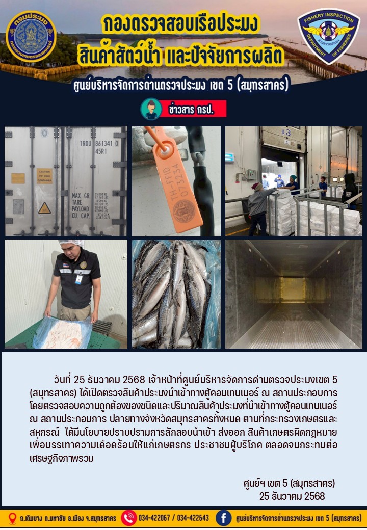 วันที่ 25 ธันวาคม 2568 เจ้าหน้าที่ศูนย์บริหารจัดการด่านตรวจประมงเขต5 (สมุทรสาคร) ได้เปิดตรวจสินค้าประมงนำเข้าทางตู้คอนเทนเนอร์ ณ สถานประกอบการ