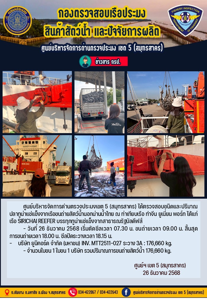 [2026-01-14] วันที่ 9 มกราคม 2569 เจ้าหน้าที่ศูนย์บริหารจัดการด่านตรวจประมงเขต5 (สม.. [2026-01-14] การขนถ่ายทูน่าแช่แข็งจากเรือขนถ่ายสัตว์น้ำสัญชาติไทย เรือ SIRICHAI REE.. [2026-01-14] วันที่ 8 มกราคม 2569 เจ้าหน้าที่ศูนย์บริหารจัดการด่านตรวจประมงเขต5 (สม.. [2026-01-14] การขนถ่ายทูน่าแช่แข็งจากเรือขนถ่ายสัตว์น้ำสัญชาติไทย เรือ SIRICHAI REE.. [2026-01-14] วันที่ 7 มกราคม 2569 เจ้าหน้าที่ศูนย์บริหารจัดการด่านตรวจประมงเขต5 (สม.. [2026-01-14] การขนถ่ายทูน่าแช่แข็งจากเรือขนถ่ายสัตว์น้ำสัญชาติไทย เรือ SIRICHAI REE.. [2026-01-14] No Gift Policy : ไม่รับ–ไม่ให้ของขวัญและของกำนัลทุกชนิด.. [2026-01-13] รายงานการตรวจเรือประมงที่แจ้งเข้าออกประจำวันที่ 11 มกราคม 2569.. [2026-01-13] รายงานการตรวจเรือประมงที่แจ้งเข้าออกประจำวันที่ 10 มกราคม 2569.. [2026-01-13] รายงานการตรวจเรือประมงที่แจ้งเข้าออกประจำวันที่ 9 มกราคม 2569.. อ่านทั้งหมด