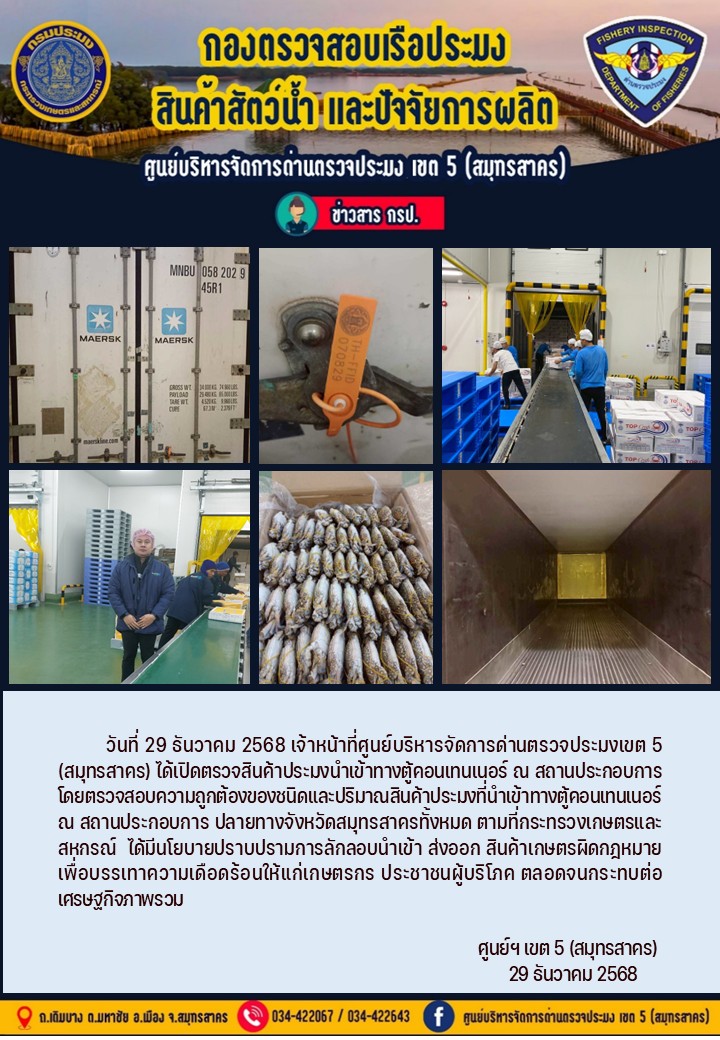 วันที่ 29 ธันวาคม 2568 เจ้าหน้าที่ศูนย์บริหารจัดการด่านตรวจประมงเขต5 (สมุทรสาคร) ได้เปิดตรวจสินค้าประมงนำเข้าทางตู้คอนเทนเนอร์ ณ สถานประกอบการ