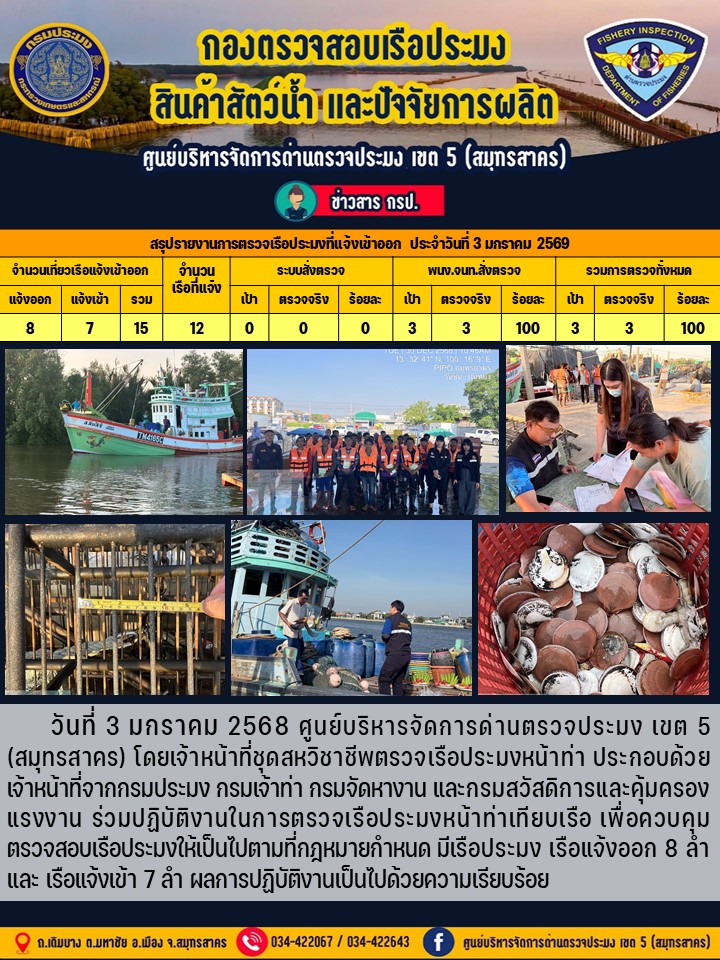 รายงานการตรวจเรือประมงที่แจ้งเข้าออกประจำวันที่ 3 มกราคม 2569