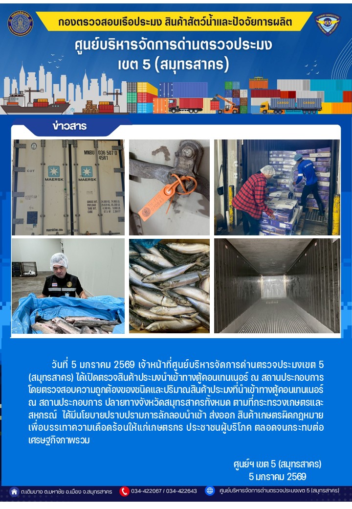 วันที่ 5 มกราคม 2569 เจ้าหน้าที่ศูนย์บริหารจัดการด่านตรวจประมงเขต5 (สมุทรสาคร) ได้เปิดตรวจสินค้าประมงนำเข้าทางตู้คอนเทนเนอร์ ณ สถานประกอบการ
