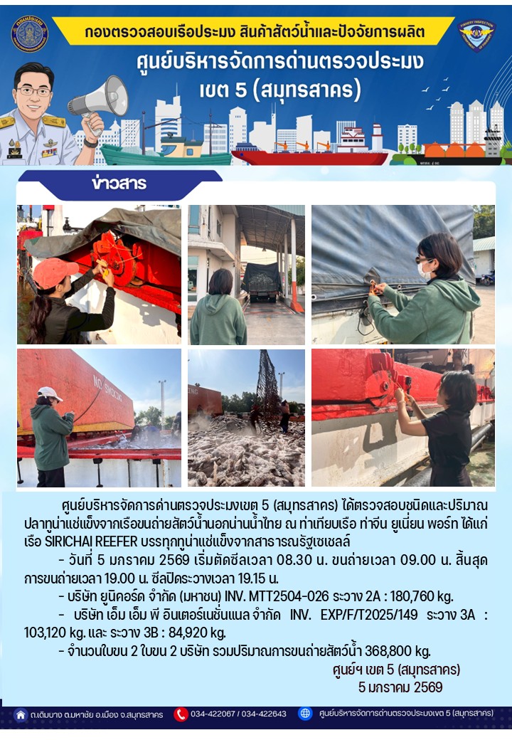 [2026-01-14] การขนถ่ายทูน่าแช่แข็งจากเรือขนถ่ายสัตว์น้ำสัญชาติไทย เรือ SIRICHAI REE.. [2026-01-14] วันที่ 8 มกราคม 2569 เจ้าหน้าที่ศูนย์บริหารจัดการด่านตรวจประมงเขต5 (สม.. [2026-01-14] การขนถ่ายทูน่าแช่แข็งจากเรือขนถ่ายสัตว์น้ำสัญชาติไทย เรือ SIRICHAI REE.. [2026-01-14] วันที่ 7 มกราคม 2569 เจ้าหน้าที่ศูนย์บริหารจัดการด่านตรวจประมงเขต5 (สม.. [2026-01-14] การขนถ่ายทูน่าแช่แข็งจากเรือขนถ่ายสัตว์น้ำสัญชาติไทย เรือ SIRICHAI REE.. [2026-01-14] No Gift Policy : ไม่รับ–ไม่ให้ของขวัญและของกำนัลทุกชนิด.. [2026-01-13] รายงานการตรวจเรือประมงที่แจ้งเข้าออกประจำวันที่ 11 มกราคม 2569.. [2026-01-13] รายงานการตรวจเรือประมงที่แจ้งเข้าออกประจำวันที่ 10 มกราคม 2569.. [2026-01-13] รายงานการตรวจเรือประมงที่แจ้งเข้าออกประจำวันที่ 9 มกราคม 2569.. [2026-01-13] วันที่ 6 มกราคม 2569 เจ้าหน้าที่ศูนย์บริหารจัดการด่านตรวจประมงเขต5 (สม.. อ่านทั้งหมด