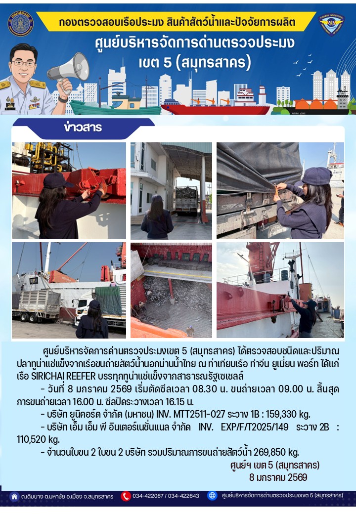 [2026-01-14] วันที่ 9 มกราคม 2569 เจ้าหน้าที่ศูนย์บริหารจัดการด่านตรวจประมงเขต5 (สม.. [2026-01-14] การขนถ่ายทูน่าแช่แข็งจากเรือขนถ่ายสัตว์น้ำสัญชาติไทย เรือ SIRICHAI REE.. [2026-01-14] วันที่ 8 มกราคม 2569 เจ้าหน้าที่ศูนย์บริหารจัดการด่านตรวจประมงเขต5 (สม.. [2026-01-14] การขนถ่ายทูน่าแช่แข็งจากเรือขนถ่ายสัตว์น้ำสัญชาติไทย เรือ SIRICHAI REE.. [2026-01-14] วันที่ 7 มกราคม 2569 เจ้าหน้าที่ศูนย์บริหารจัดการด่านตรวจประมงเขต5 (สม.. [2026-01-14] การขนถ่ายทูน่าแช่แข็งจากเรือขนถ่ายสัตว์น้ำสัญชาติไทย เรือ SIRICHAI REE.. [2026-01-14] No Gift Policy : ไม่รับ–ไม่ให้ของขวัญและของกำนัลทุกชนิด.. [2026-01-13] รายงานการตรวจเรือประมงที่แจ้งเข้าออกประจำวันที่ 11 มกราคม 2569.. [2026-01-13] รายงานการตรวจเรือประมงที่แจ้งเข้าออกประจำวันที่ 10 มกราคม 2569.. [2026-01-13] รายงานการตรวจเรือประมงที่แจ้งเข้าออกประจำวันที่ 9 มกราคม 2569.. อ่านทั้งหมด