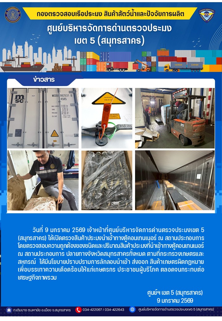 วันที่ 9 มกราคม 2569 เจ้าหน้าที่ศูนย์บริหารจัดการด่านตรวจประมงเขต5 (สมุทรสาคร) ได้เปิดตรวจสินค้าประมงนำเข้าทางตู้คอนเทนเนอร์ ณ สถานประกอบการ
