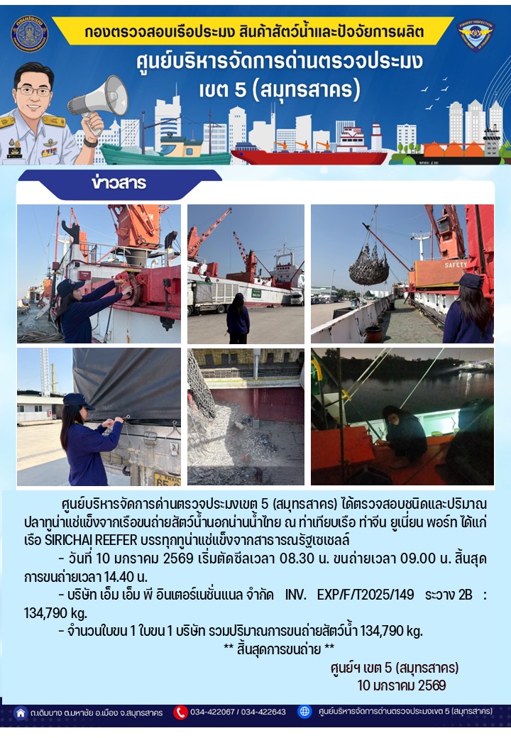 [2026-01-16] รายงานการตรวจเรือประมงที่แจ้งเข้าออกประจำวันที่ 14 มกราคม 2569.. [2026-01-16] วันที่ 13 มกราคม 2569 เจ้าหน้าที่ศูนย์บริหารจัดการด่านตรวจประมงเขต5 (ส.. [2026-01-16] รายงานการตรวจเรือประมงที่แจ้งเข้าออกประจำวันที่ 13 มกราคม 2569.. [2026-01-16] วันที่ 12 มกราคม 2569 เจ้าหน้าที่ศูนย์บริหารจัดการด่านตรวจประมงเขต5 (ส.. [2026-01-16] รายงานการตรวจเรือประมงที่แจ้งเข้าออกประจำวันที่ 12 มกราคม 2569.. [2026-01-16] วันที่ 11 มกราคม 2569 เจ้าหน้าที่ศูนย์บริหารจัดการด่านตรวจประมงเขต5 (ส.. [2026-01-16] วันที่ 10 มกราคม 2569 เจ้าหน้าที่ศูนย์บริหารจัดการด่านตรวจประมงเขต5 (ส.. [2026-01-16] การขนถ่ายทูน่าแช่แข็งจากเรือขนถ่ายสัตว์น้ำสัญชาติไทย เรือ SIRICHAI REE.. [2026-01-16] การขนถ่ายทูน่าแช่แข็งจากเรือขนถ่ายสัตว์น้ำสัญชาติไทย เรือ SIRICHAI REE.. [2026-01-14] วันที่ 9 มกราคม 2569 เจ้าหน้าที่ศูนย์บริหารจัดการด่านตรวจประมงเขต5 (สม.. อ่านทั้งหมด