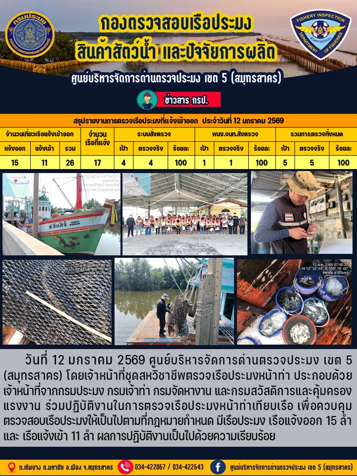 รายงานการตรวจเรือประมงที่แจ้งเข้าออกประจำวันที่ 12 มกราคม 2569
