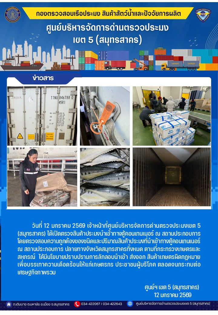 วันที่ 12 มกราคม 2569 เจ้าหน้าที่ศูนย์บริหารจัดการด่านตรวจประมงเขต5 (สมุทรสาคร) ได้เปิดตรวจสินค้าประมงนำเข้าทางตู้คอนเทนเนอร์ ณ สถานประกอบการ