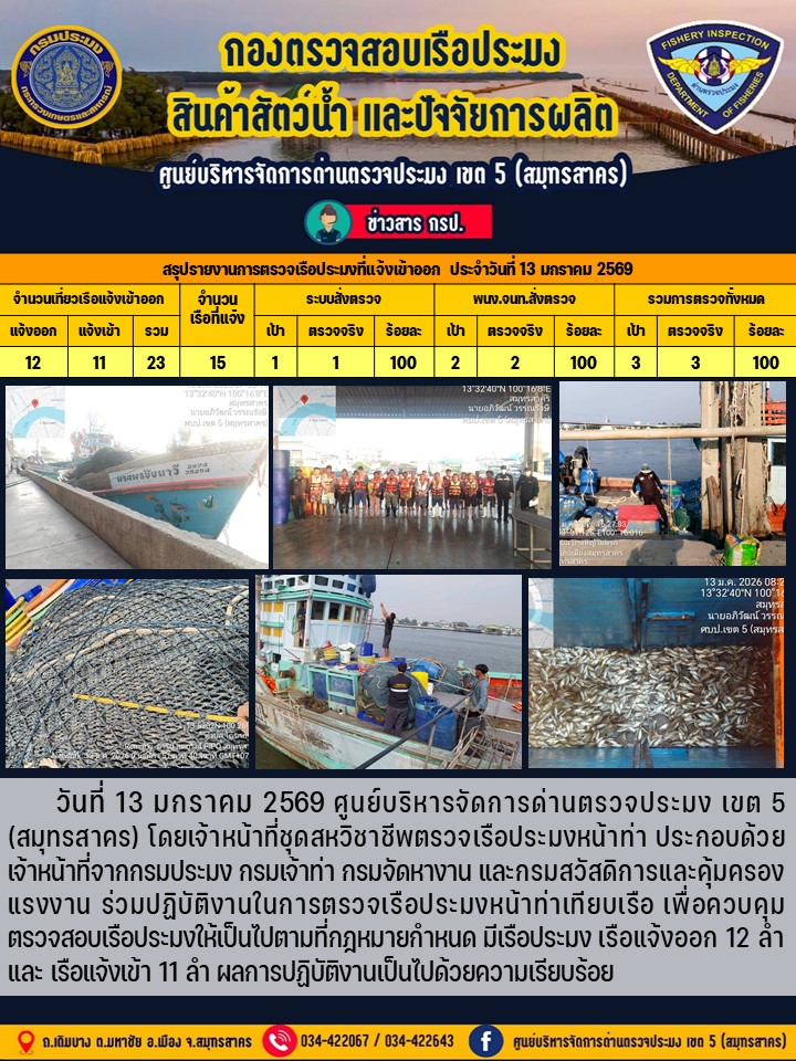 รายงานการตรวจเรือประมงที่แจ้งเข้าออกประจำวันที่ 13 มกราคม 2569