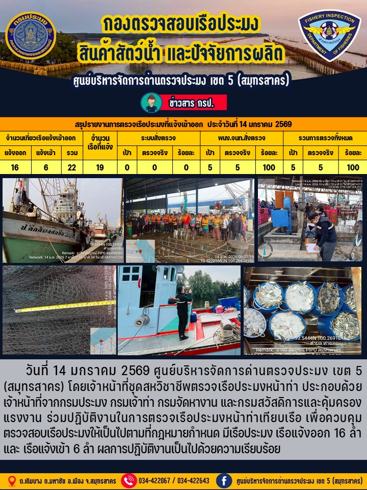 รายงานการตรวจเรือประมงที่แจ้งเข้าออกประจำวันที่ 14 มกราคม 2569