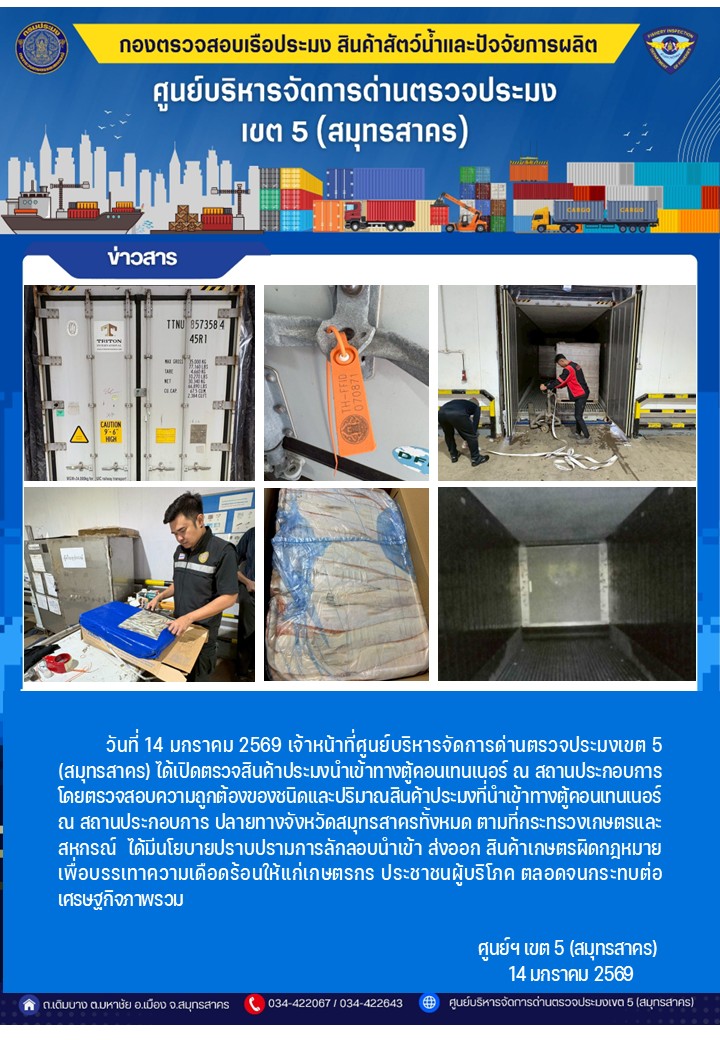 วันที่ 14 มกราคม 2569 เจ้าหน้าที่ศูนย์บริหารจัดการด่านตรวจประมงเขต5 (สมุทรสาคร) ได้เปิดตรวจสินค้าประมงนำเข้าทางตู้คอนเทนเนอร์ ณ สถานประกอบการ